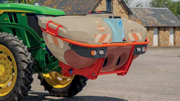 Die Frontanbauspritze PF hat kompakte Maße und bietet dadurch eine große Sichtfreiheit von der Traktorkabine aus. Durch die gut sichtbare Füllstandsanzeige, seitlich am Tank, ist der Behälterfüllstand sehr leicht vom Traktorsitz einsehbar.