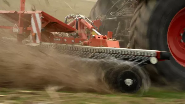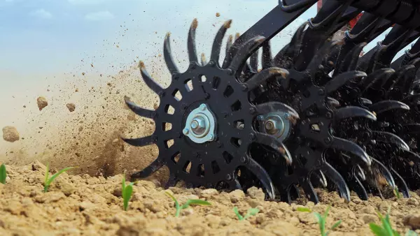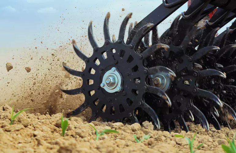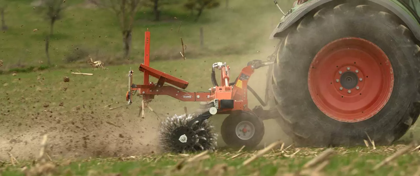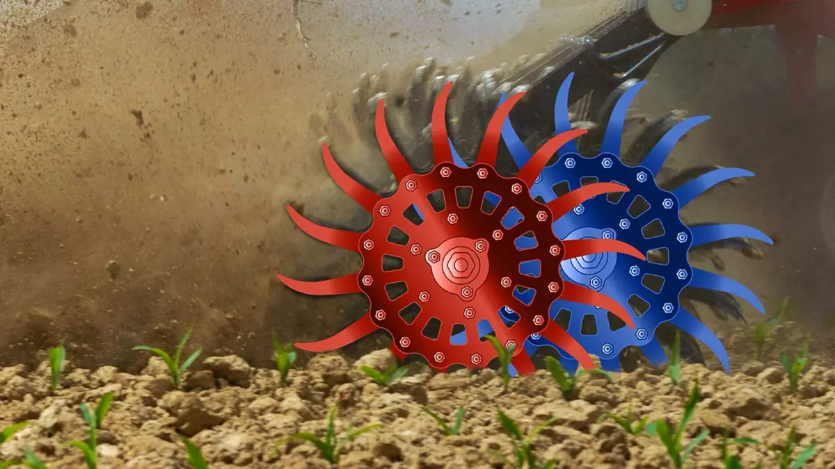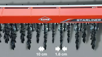 Die Rotorsterne haben einen Abstand von 10 cm zueinander und die Löffelbreite der Rotorsterne beträgt 1,8 cm. Somit wird die gesamte Fläche bearbeitet und Unkraut entfernt.