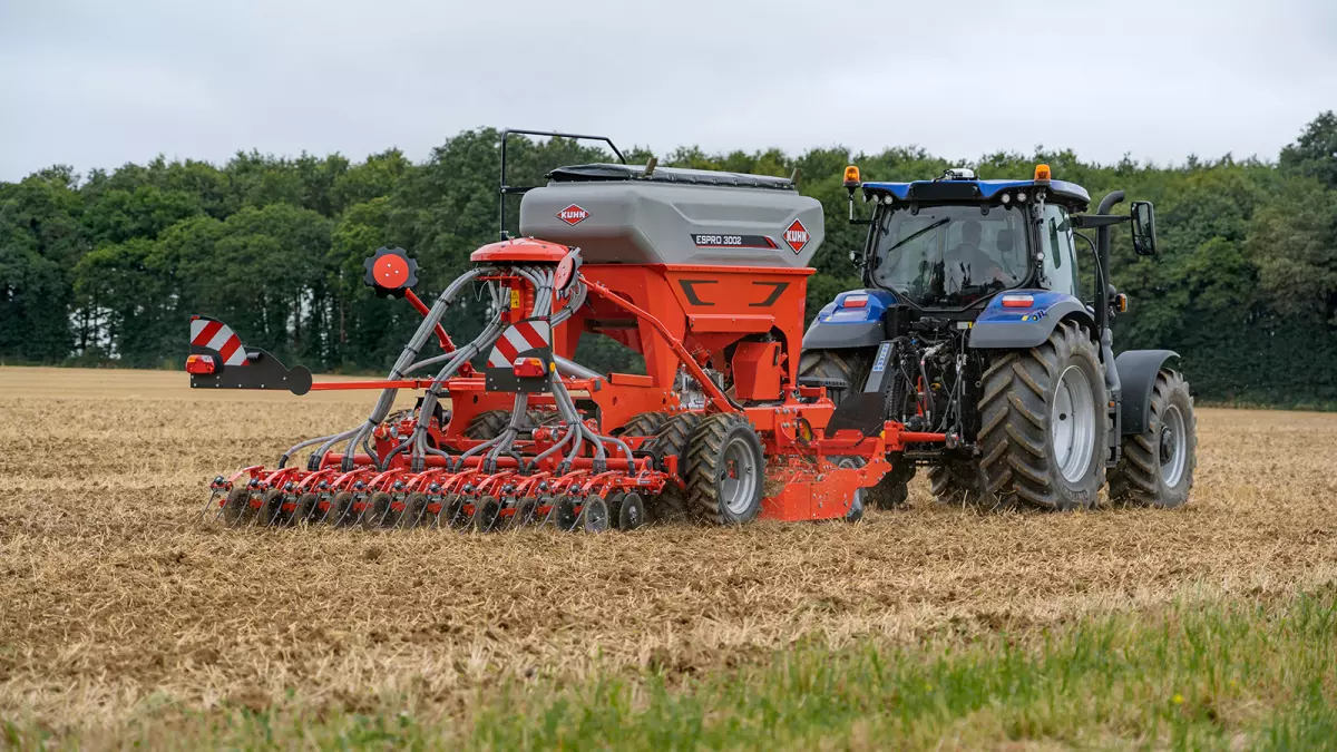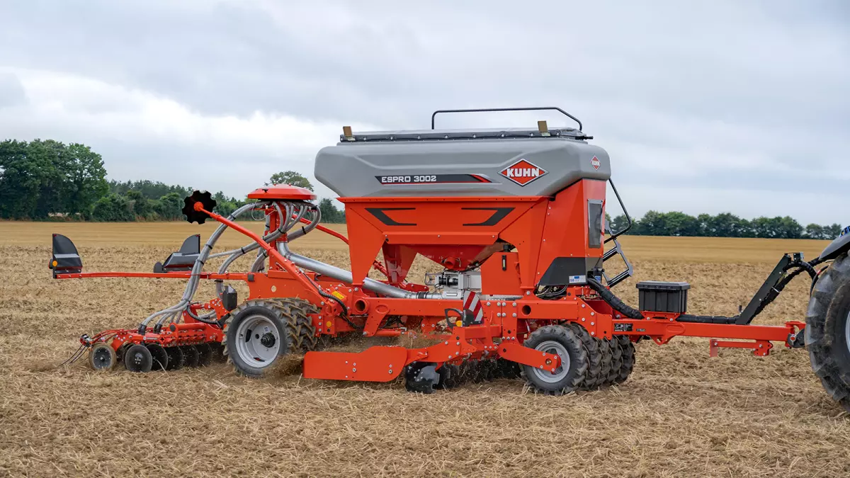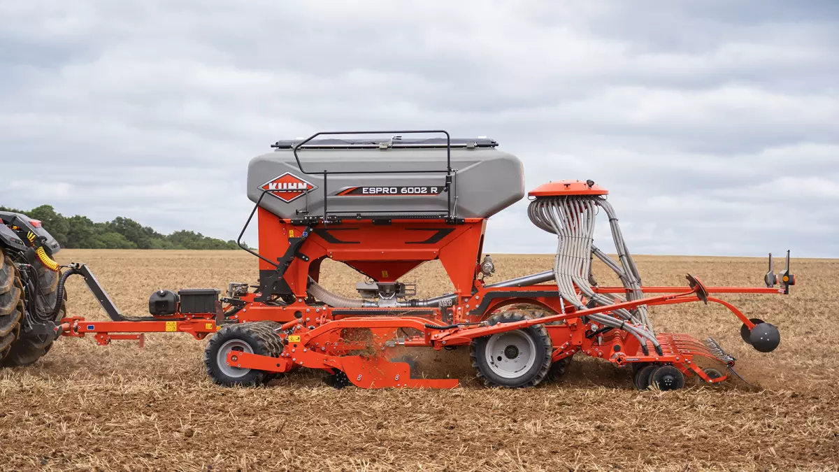 Die Packerräder der Drillmaschinen der Baureihe ESPRO R sind um 200 mm nach vorn bzw. hinten versetzt angeordnet. Das verhindert ein Aufschieben von Erde und Pflanzenresten. Ihr großer Durchmesser (900 mm) reduziert den Rollwiderstand und damit den Zugleistungsbedarf. Das schmale Profil erleichtert das Abfließen von Erde und Pflanzenrückständen. Bemerkenswert: Die Räder sind nicht miteinander verbunden, so dass ein Radieren am Feldende verhindert wird. Die rechteckige Form der Reifen ermöglicht