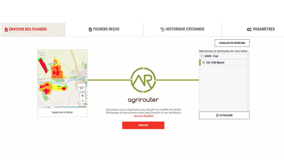Wenn Sie Ihre Applikationskarten im Datei-Format SHP oder ISOXML empfangen oder erstellen, können Sie sie im ZIP-Format komprimieren und direkt an das Terminal senden. Das ist sehr einfach zu bewerkstelligen. Sobald die Arbeiten abgeschlossen sind, können die Aufträge an KUHN EasyTransfer zurückgeschickt werden, damit Sie sie anschließend in Ihrer Betriebssoftware nutzen können.
