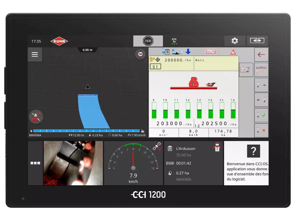 Der CCI 1200 bietet branchenführende Leistung und Vielseitigkeit in einem ISOBUS-Terminal. Der 12,1-Zoll-Touchscreen mit Blendschutz bietet eine hervorragende Sicht für den Bediener bei verschiedenen Lichtverhältnissen. Die Multi-Touch-Funktionalität des Touchscreens bietet eine Smartphone-ähnliche intuitive Navigation und Auswahlmöglichkeiten auf dem Display. Durch die Größe des Terminals können mehrere Bildschirme gleichzeitig angezeigt werden. Beispielsweise können ein Maschinenarbeitsbildschirm und ein Kamerabild gleichzeitig angezeigt werden. Oder zeigen Sie einen Maschinenarbeitsbildschirm und die Informationen des Traktors nebeneinander an. Die Anzeigefunktionen des CCI 1200 machen mehrere Kabinenbildschirme überflüssig und helfen, Platz zu sparen.