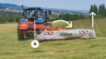 Je höher die nach hinten wirkenden Kräfte auf den Mähbalken sind (1), desto stärker reagiert die Entlastung (2) und passt sich so allen Bodenunebenheiten an. Dieses System hat mehrere Vorteile: Der Kraftstoffverbrauch sinkt, der Verschleiß der Gleitkufen wird reduziert, es wird weniger Schmutz in das Schwad gezogen und die Grasnarbe wird geschont. Außerdem lässt sich der Auflagedruck bequem von der Schlepperkabine aus einstellen.