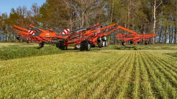 Weitere Vorteile sind der ruhige, leise Lauf und der geringe Verschleiß. Das Hydraulikaggregat der Vierkreiselschwader ist auf dem schwenkbaren Anbaubock des Maschinenrahmens positioniert. Dadurch sind auch enge Kurvenfahrten problemlos möglich. Zusätzlich kann die Zapfwellendrehzahl von der Kabine aus verändert werden, um sich optimal an Art und Menge des Erntegutes anzupassen.