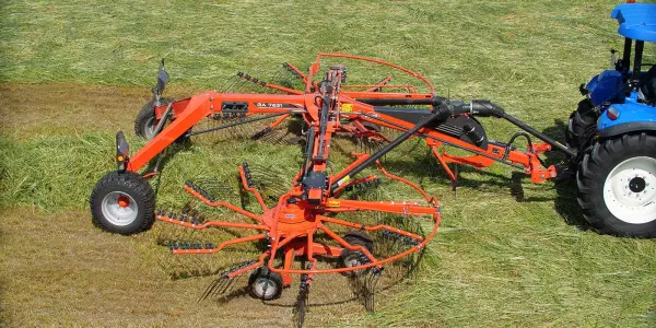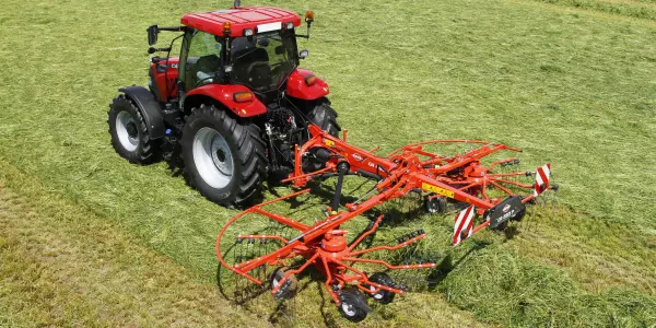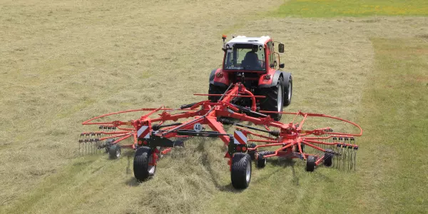 Der angebaute Zweikreiselschwader GA 6501 P legt das Futter in einem Mittelschwad ab. Die Arbeitsbreite ist einstellbar zwischen 5,65 und 6,40 m. Die Rechqualität dieser Baureihe ist beeindruckend und die Schwadformung für eine schnelle Abtrocknung optimiert.