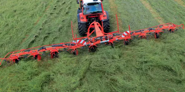 Das Wenden ist ein Schlüsselverfahren in der Grünfuttererntetechnik, das die Trocknung des Schwads beschleunigt. Der Zweck des Zettwendens ist einfach: den Energiewert des Futters zu erhalten und wetterbedingte Verluste zu reduzieren. Der kleine Durchmesser der Rotoren der KUHN-Zettwender ist hier der Schlüssel zum Erfolg! Für kleinere Betriebe hat KUHN Zettwender mit einer Arbeitsbreite von bis zu 6,5 Metern entwickelt.