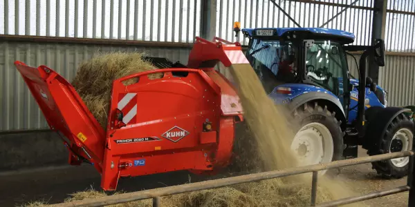 Der PRIMOR GII 110.1 Polydrive ist ein Verteilgerät für alle Futterarten (Maissilage, Heu, Silageballen ...) mit 11 m³ Fassungsvermögen, das bis zu vier 1,80-m-Rundballen oder zwei 2,70-m-Quaderballen aufnehmen kann. Entwickelt für großes Fassungsvermögen bei geringer Gesamthöhe.